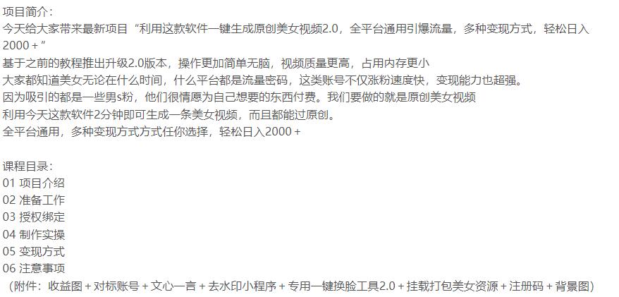 科技 抖音课程 数字化系列 新媒体运营 2024-03-04 软件一键生成原创美女视频全平台通用引爆流量 利用这款软件一键生成原创美女视频2.0 全平台通用引爆流量 生成海报 下载海报 相关资源抖音财神祝福贴壁纸号新玩法只需一个软件就能在家轻松搞定录课直播(obs软件教学)46节课程热舞美女直播24小时矩阵全天挂机被动收入热门项目全自动输出爆文粘贴复制矩阵操作AI掘金项目抖音多种无人直播项目画中画新技巧理论+实操 下载 大礼包 微信 抖音 文案大全 素材 致富技术 视频 讲座 课程 软件 运营 问题解答 本资源下载说明:本站也是始于兴趣,源于网络,仅用于学习及研究使用,切勿用于商业用途,如侵权联系删除! 其版权归该资源的合法拥有者所有。漫资源 » 软件一键生成原创美女视频全平台通用引爆流量