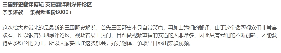 漫资源 数字化系列 新媒体运营 资源分享 2024-03-05 英语翻译三国野史剪辑刷爆评论区 三国野史翻译剪辑 英语翻译刷爆评论区 条条爆款 生成海报 下载海报 相关资源微创业全能训练营认证班名师讲座宠物私域赛道新玩法创业副业项目教程大合集无需露脸可用AI创造治愈系佛学视频课程抖音快速起号涨粉落地实战实操教程 (16节) 下载 外语学习 大礼包 文案大全 素材 视频 讲座 课程 运营 问题解答 本资源下载说明:本站也是始于兴趣,源于网络,仅用于学习及研究使用,切勿用于商业用途,如侵权联系删除! 其版权归该资源的合法拥有者所有。漫资源 » 英语翻译三国野史剪辑刷爆评论区
