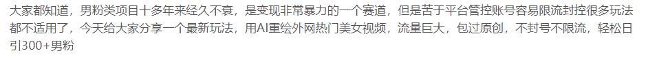 科技 数字化系列 新媒体运营 资源分享 2024-03-14 蓝海尤物计划AI重绘美女视频 蓝海尤物计划,AI重绘美女视频! 生成海报 下载海报 相关资源全自动输出爆文粘贴复制矩阵操作AI掘金项目一条视频变现5种收益制作AI打爆流量[全网揭秘]抖音AI小说推文超详细教程+实操刨析最新AI一键生成财神爷项目-刷爆新年祝福流量把握未来三年最赚钱的ChatGPT创富系统 ChatGPT 下载 大礼包 微信 抖音 文案大全 素材 视频 讲座 课程 运营 问题解答 本资源下载说明:本站也是始于兴趣,源于网络,仅用于学习及研究使用,切勿用于商业用途,如侵权联系删除! 其版权归该资源的合法拥有者所有。漫资源 » 蓝海尤物计划AI重绘美女视频