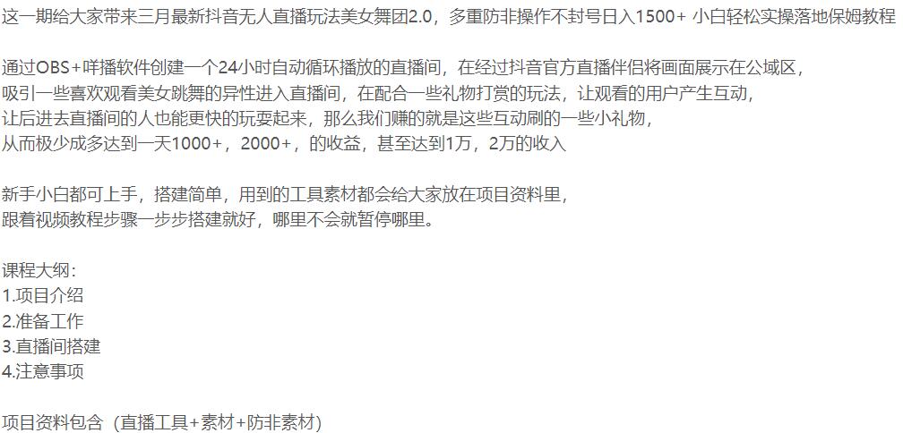 漫资源 抖音课程 数字化系列 新媒体运营 2024-03-18 抖音无人直播美女舞团2.0玩法实操落地保姆教程 三月最新抖音无人直播玩法美女舞团2.0,小白轻松实操落地保姆教程! 生成海报 下载海报 相关资源流量训练营之内容运营专项课一条视频变现5种收益制作AI打爆流量快手美女IP直播手把手教学【附软件素材】暴利冷门傻瓜式操作项目-象棋竞技掘金[怀旧新娘]无人直播整蛊互动玩法(含全套开播教程+软件+视频素材+音效) 下载 大礼包 微信 抖音 文案大全 素材 致富技术 视频 讲座 设计 课程 运营 问题解答 本资源下载说明:本站也是始于兴趣,源于网络,仅用于学习及研究使用,切勿用于商业用途,如侵权联系删除! 其版权归该资源的合法拥有者所有。漫资源 » 抖音无人直播美女舞团2.0玩法实操落地保姆教程