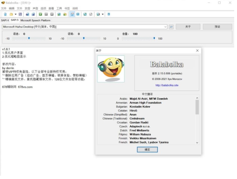 Balabolka使用微软的语音API(SAPI)的各种版本,它可以改变语音的参数,包括语度和语调。用户可以应用特殊的替代清单,以提高语音的清晰度质量。当你想改变的单词拼写时这个功能就非常有用。纠正发音规则使用VBScript的语法。