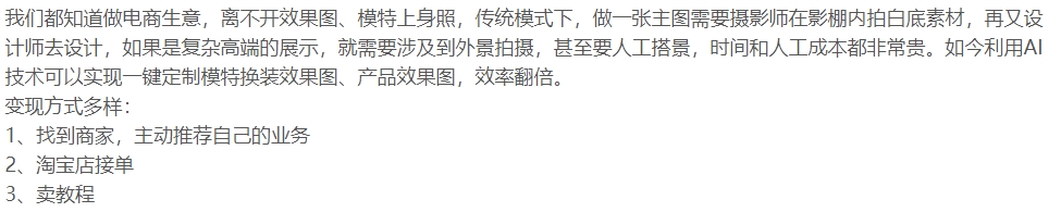 AI制作一键生成模特换装照,电商蓝海副业!一方面是因为AI绘画工具不像你招聘的设计师一样听你的话(简单说就是不好控制,入门虽然简单,但是进阶还是有门槛的),另一方面也是因为AI是一个新兴的事物,很多老板们还没发现它的好处(最好慢点发现,要不就得开始裁员了)不过,我最近了解到AI绘画在电商行业真的已经开始落地应用了,具体应用方向要么是做包装设计、直播间虚拟背景设计,还有就是做AI模特!