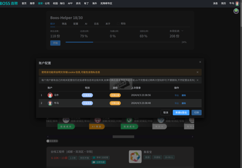 Boss直聘助手是一款开源油猴插件,通过优化UI、去除广告,支持批量投递简历、高级筛选、GPT自动打招呼和多账号管理等功能,旨在减少投递简历的麻烦并提高效率。该助手使用VIte + Vue3 + element-plus技术栈,代码经过Vite打包无加密混淆,感兴趣的同学可以安装体验。