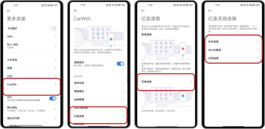 CarWith安装最新版本V2.3.0,支持亿连通道投屏CarWith支持有线和无线两种方式互联投屏,后装亿连车机版V6.0以及以上版本都可支持。手机打开设置-更多连接-CarWith-选择亿连连接根据车机上亿连支持的连接方式,选择CarWith连接方式支持有线和无线两种互联方式;亿连无线支持热点连接、WLAN直连、扫码连接;通过无线连接中的热点连接来演示如何连接;亿连连接界面选择无线手机;手机连接车机蓝牙,连接成功后点击下一步手机打开热点,车机连接手机热点,连接成功后点击下一步点击开始连接,连接成功后即可投屏