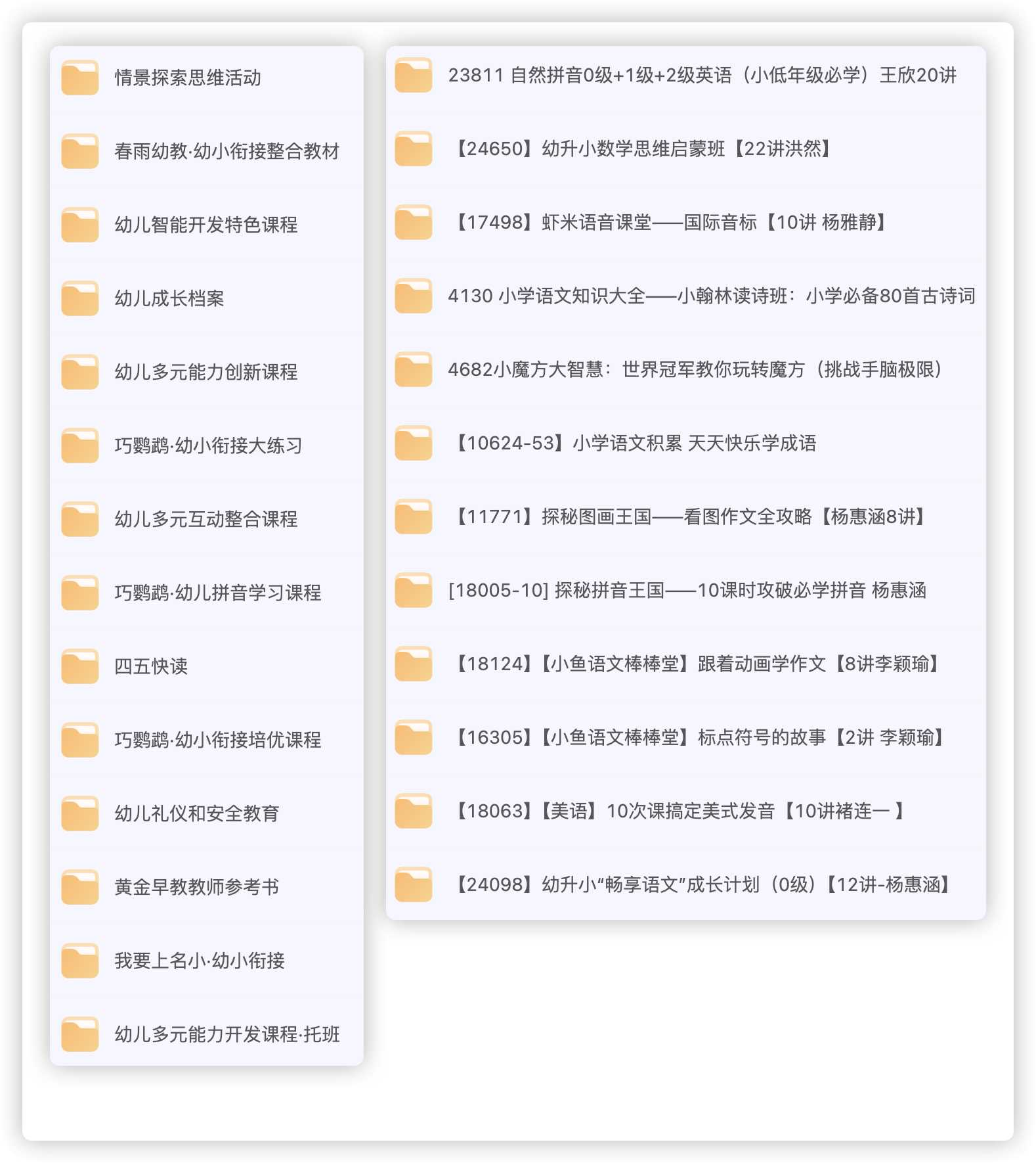 这套幼小衔接全套整合课程是专为幼儿园儿童设计的学习资源,旨在帮助他们顺利过渡到小学阶段。这套材料还包括了学而思提供的幼升小视频课程,这些视频课程包括语言、数学、英语等多个学科的学习内容。通过这套幼小衔接课程,孩子们可以在进入小学之前,对基础知识有一个全面的了解和掌握,减少入学后的适应期,提升学习兴趣和自信心。