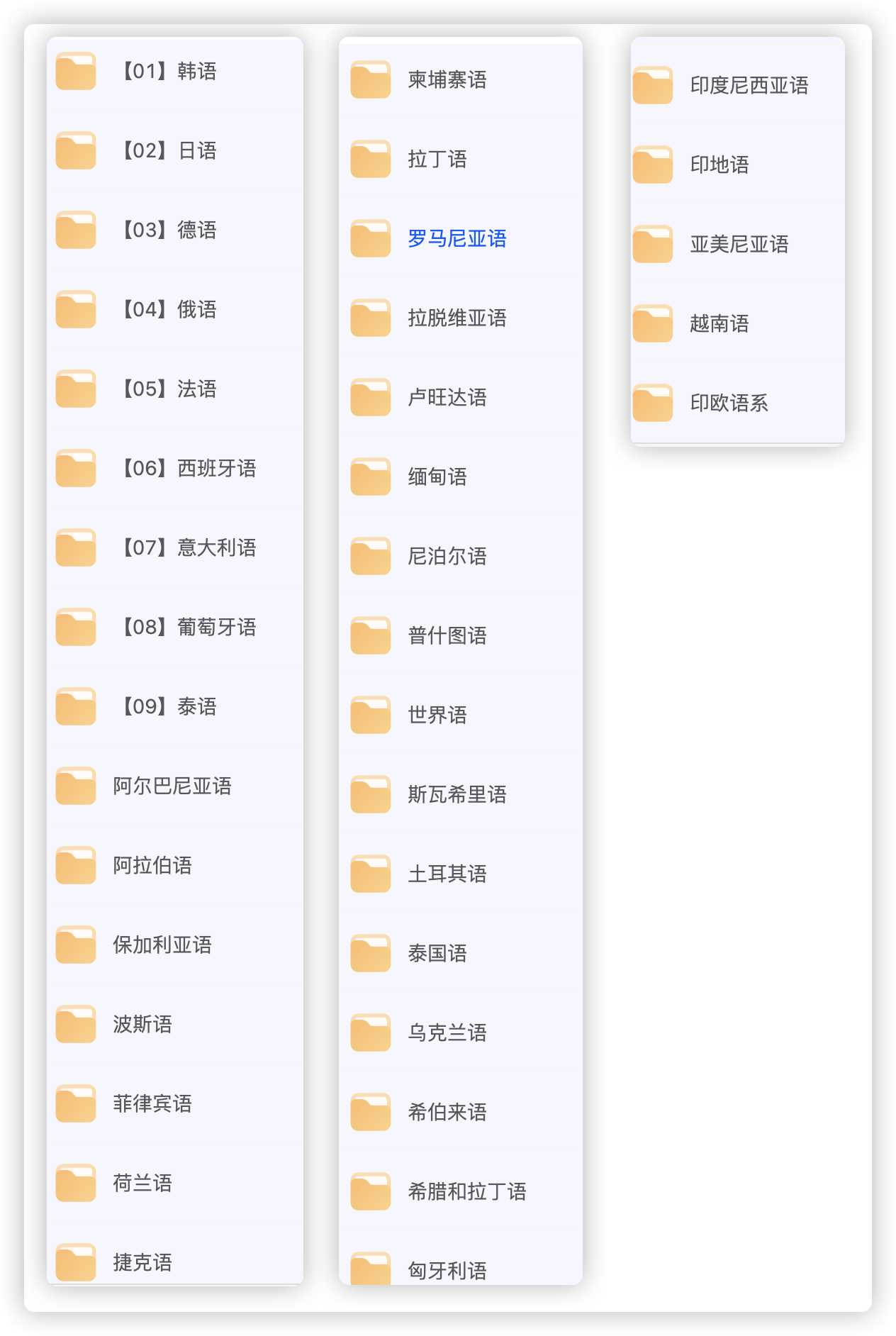 薪默 亲子课程 初中课程 小学课程 2024-10-21 38国小语种课程合集 38门外语小语种的课程合集,包括韩语、泰语、日语、德语、俄语、法语、西班牙语、意大利语、葡萄牙语、阿拉伯语、希腊语、拉丁语、越南语、荷兰语、波斯语等。 生成海报 下载海报 相关资源阿里云盘-海量分享(更新至2025年11月8日)优等生快乐暑假 1~8年级 语数英暑假作业合集人大附语文名师申怡《上下诗词五千年》 视频+音频+文字资料中小学古诗词鉴赏技巧50讲全能英语三合一教学视频课程 下载 亲子课程 初中教程 外语学习 大礼包 小学教程 素材 视频 讲座 课程 高中备考 本资源下载说明:本站也是始于兴趣,源于网络,仅用于学习及研究使用,切勿用于商业用途,如侵权联系删除! 其版权归该资源的合法拥有者所有。漫资源 » 38国小语种课程合集