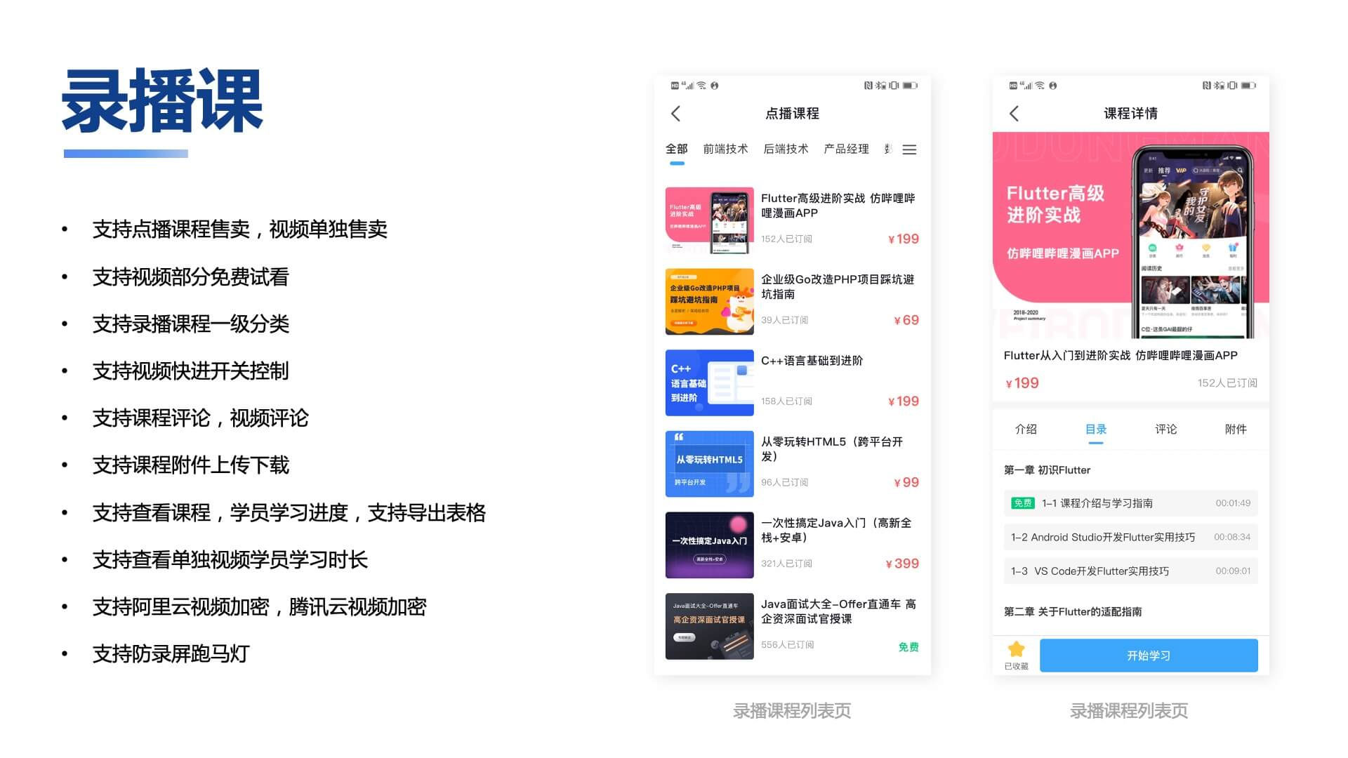 支持录播,直播,图文,考试练习等多种教培形式;