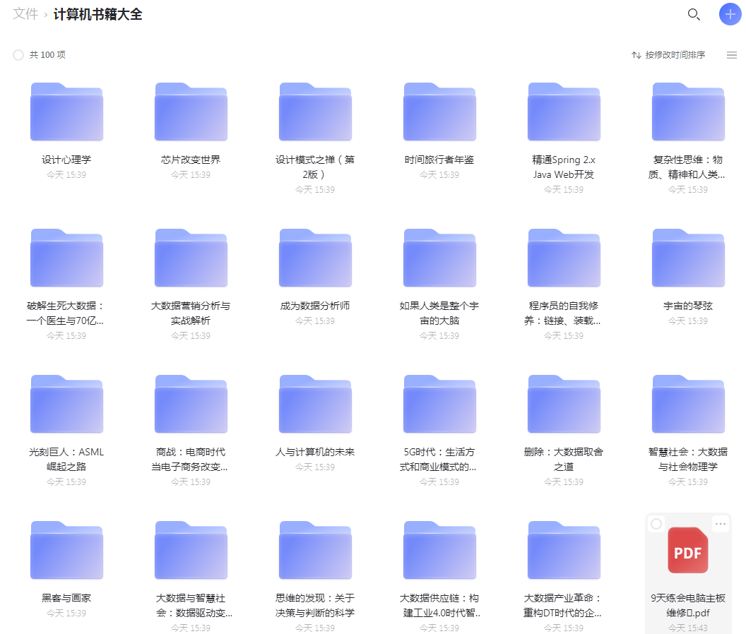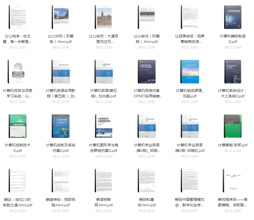 计算机类的书籍那么贵,作为一个几个小时看完一本书且机不离身的程序员,天天买纸质书是不可能的了,所以对电子书的需求量还是挺多的。为了方便广大的小伙伴也能方便找到对应的电子书,我花费洪荒之力收集了几百本常用的电子书,并且为了解决百度云链接容易失效的问题,我把电子书全部下载打包上传,都有哪些电子书呢?