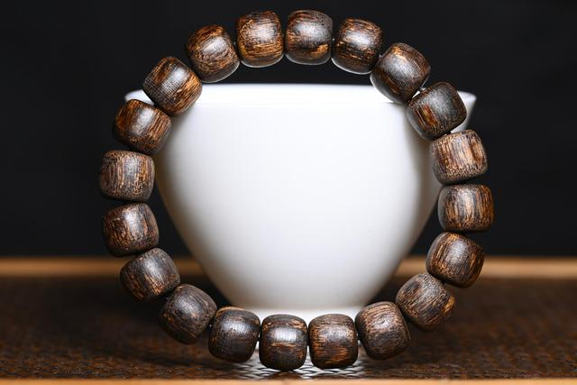 在树心结油的奇楠,蜜脂化非常好,在纤维不被切断的情况下维持柔软,所以奇楠可以“削之成卷、捏之成丸”。但若削成片状之后,水分流失,就会硬化,所以奇楠车珠成手串后,时间久了表面也会慢慢硬化。是比钻石、翡翠更为稀有的木头精华。
