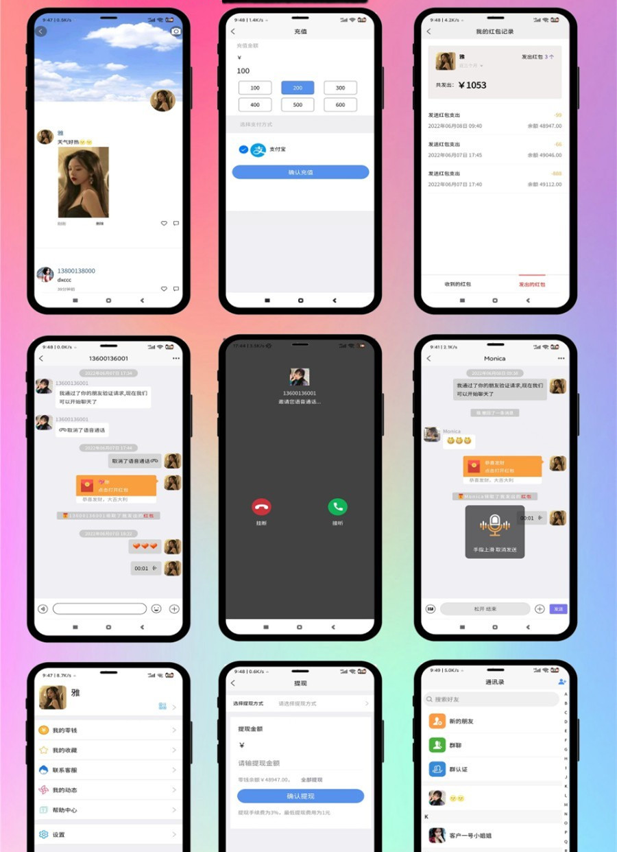 4.功能详情:(1)单聊,群聊,音视频通话(2)转账,收付款,收发红包(3)朋友圈个人动态分享 三个主要功能其他的细节问题想理解的朋友可以联络用户或者者参照演示站自行测试,就不逐个说明了。