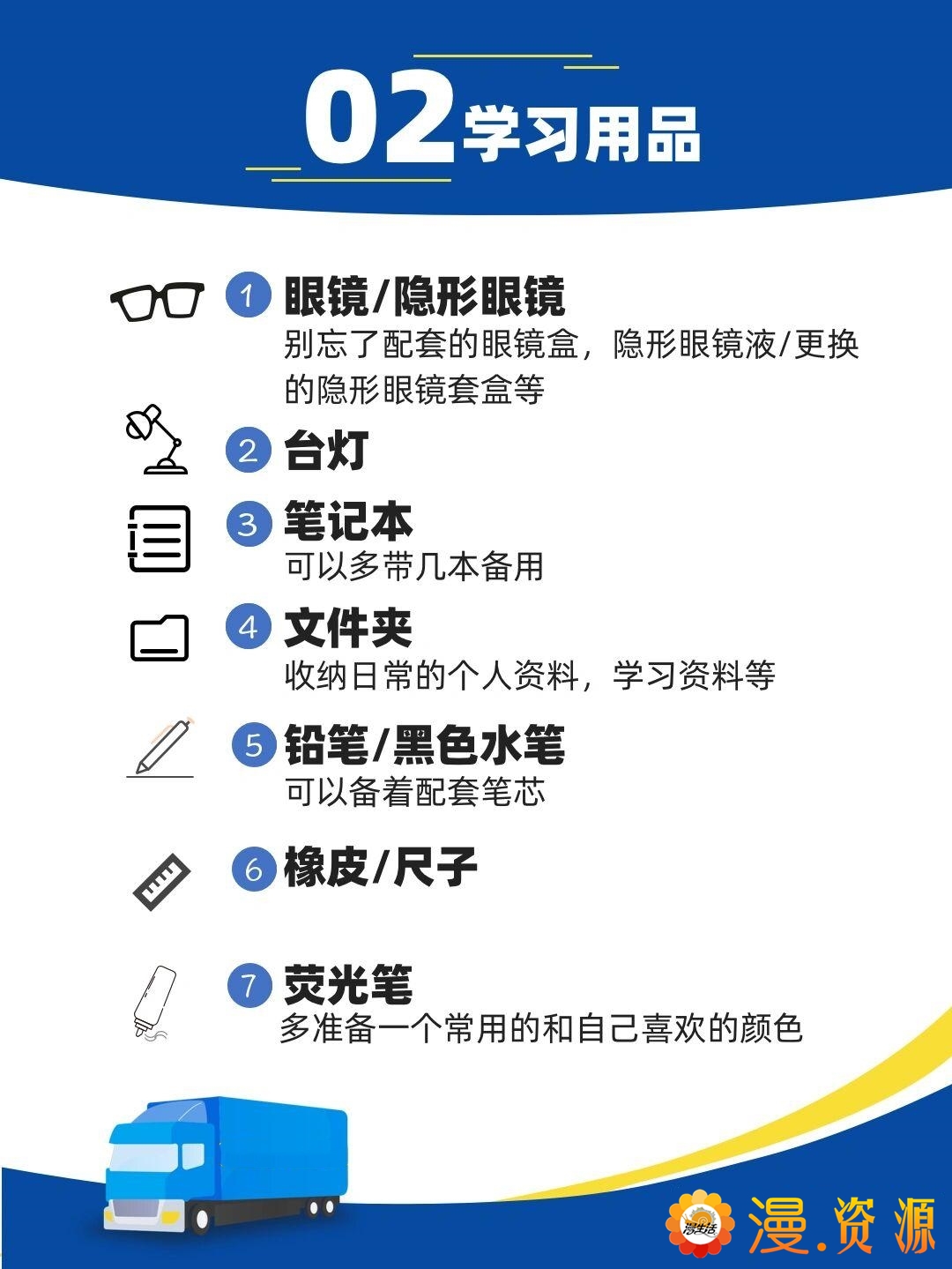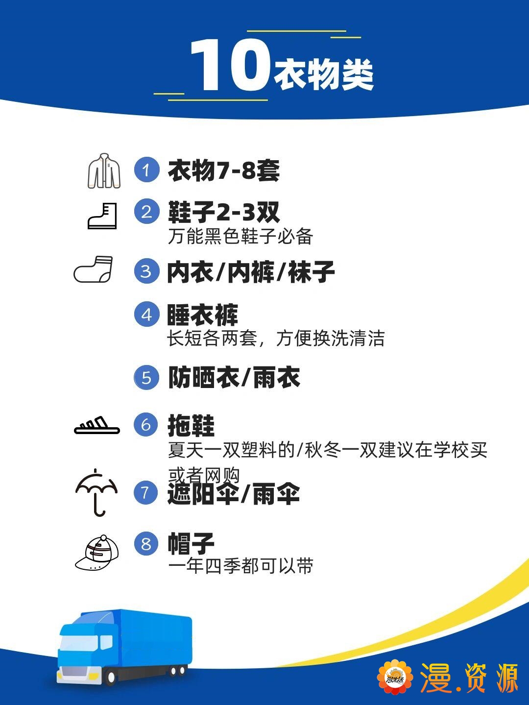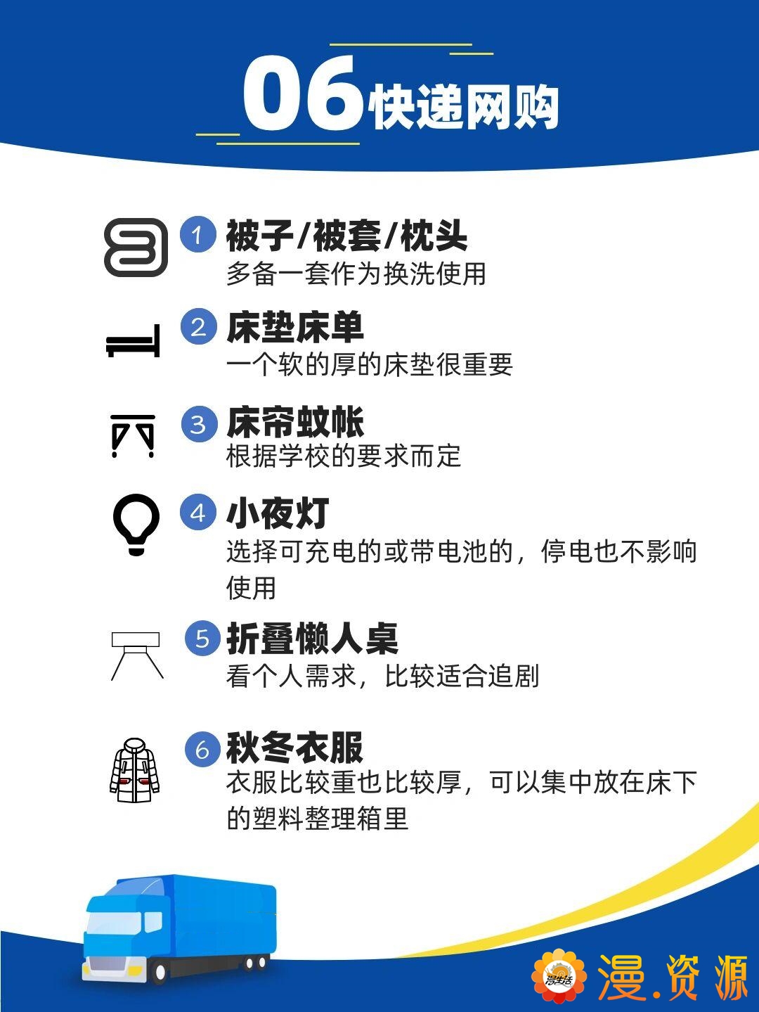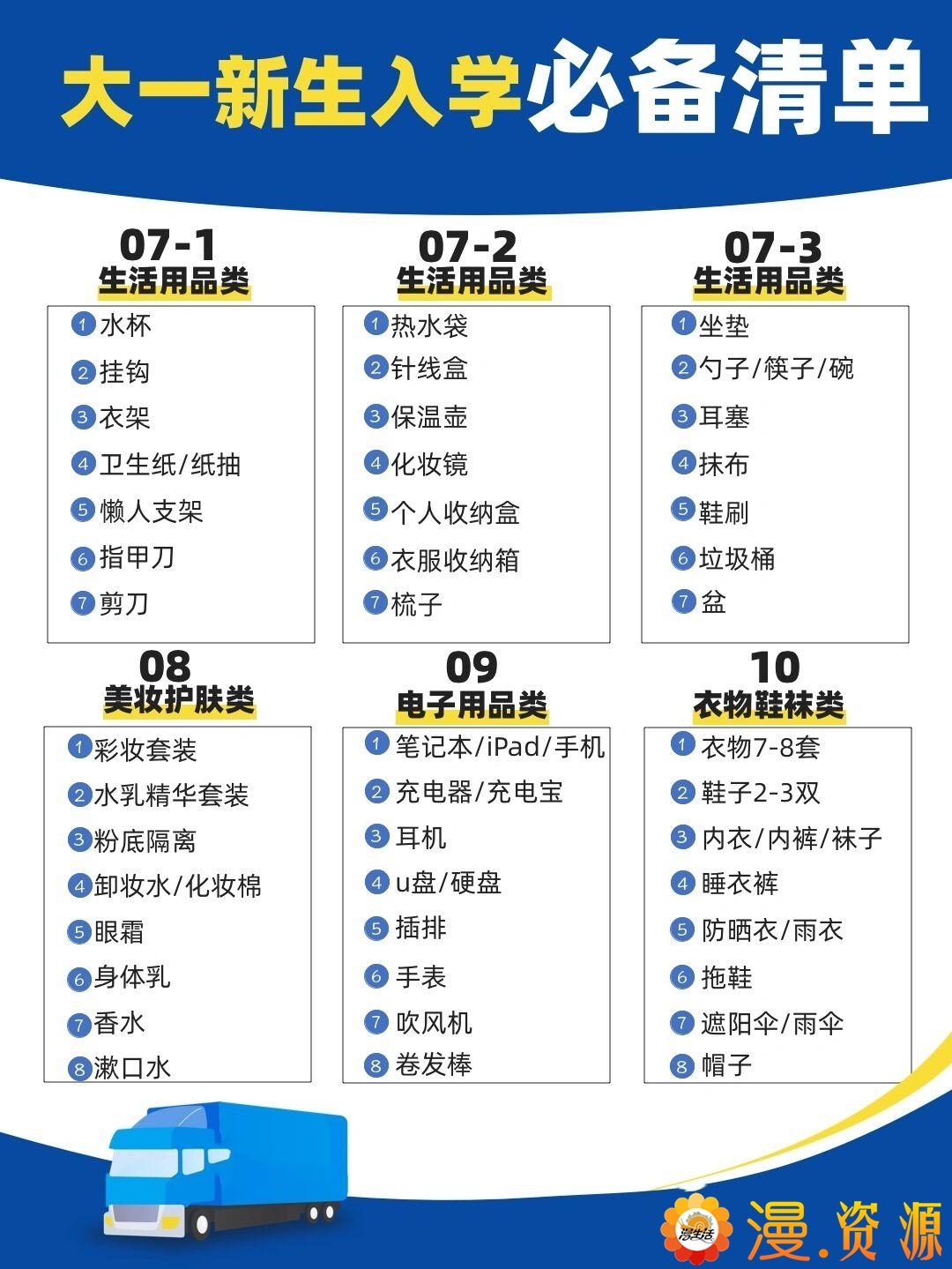 与男生相比,女生相对需要的洗护用品要多一些,可以列张清单跟新室友一起去买。除了自己日常需用外,在大学宿舍,以下所列也是很有必要准备的: