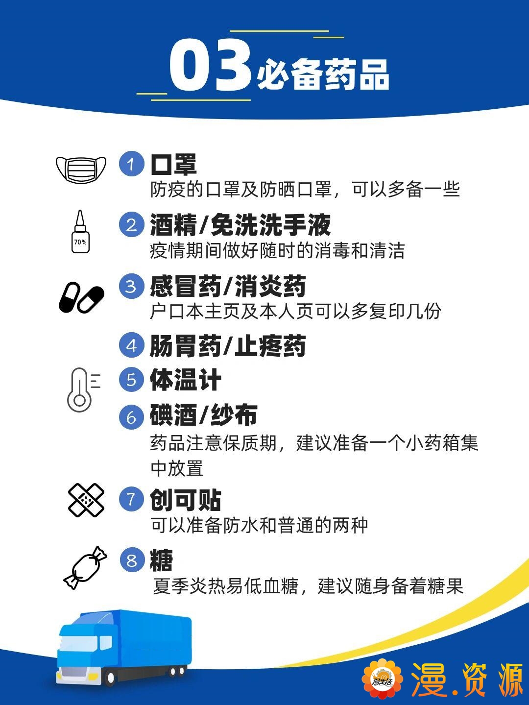 (2)防病必备:创可贴、感冒药、退烧药、消炎药、跌打损伤药、胃药,有痛经史的女生还要带缓解痛经的药等。