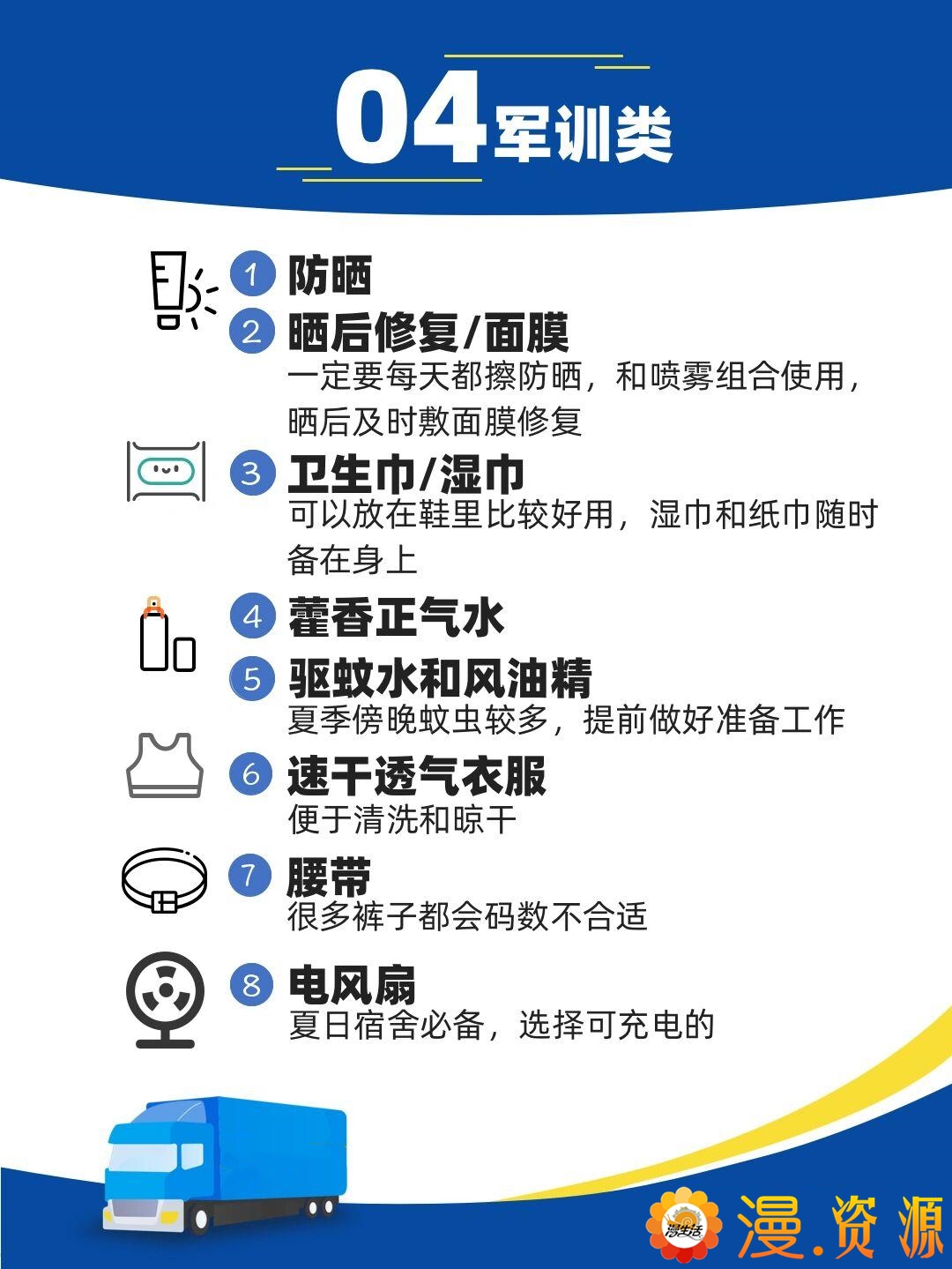 (1)军训必备:纸巾、花露水、风油精、清凉油(驱蚊止痒、治中暑都有用)等;