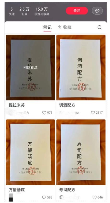然后买个二手打印机百来块钱就能买到了,再把网盘里面的小吃配方资料电子版,打印到A4纸上,顺便再花几块钱刻个章,章上写绝秘配方、内部资料等字眼,最后纸上盖上章。每天根据小吃配方打印几十张,最后拍成照片发到小红书抖音各大网络平台上。