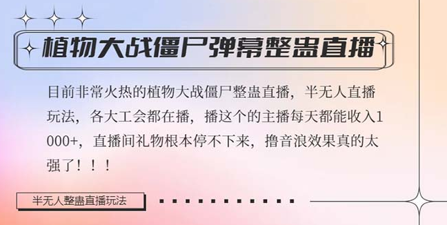 半无人直播弹幕整蛊玩法2.0,日入1000+植物大战僵尸弹幕整蛊,撸礼物音浪效果很强大,最近非常火的半无人直播弹幕整蛊玩法2.0这种直播玩法很容易吸引人,互动能力非常强,撸礼物效果非常好,在播的主播基本每天都有1000+的收入,有电脑,会玩植物大战僵尸就行,感兴趣的建议不要错过,课程包含搭建教程+游戏包+修改器+礼物图+全套直播工具...