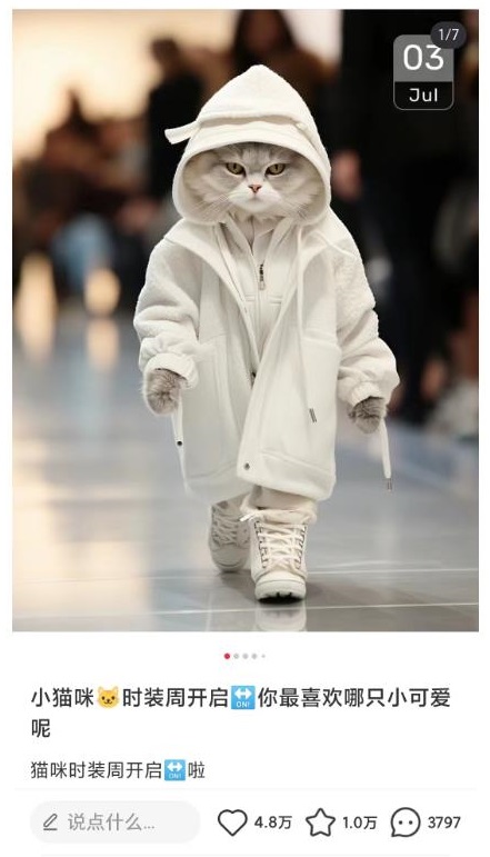 小红书最新爆款项目,Animal秀,7天变现1w+在小红书上是非常爆款的项目,动不动就几万的赞,笔记的内容主要是猫咪走秀搭配一段文案,就是一只猫穿着人类的衣服在走T台,看起来非常的新奇特,加上小红书的主要用户群体是女性用户,女大学生,少女,宝妈这类,而大部分女性都是比较喜欢猫咪这类动物,加上我们的猫咪图片非常的可爱或者酷帅,很难不爱。