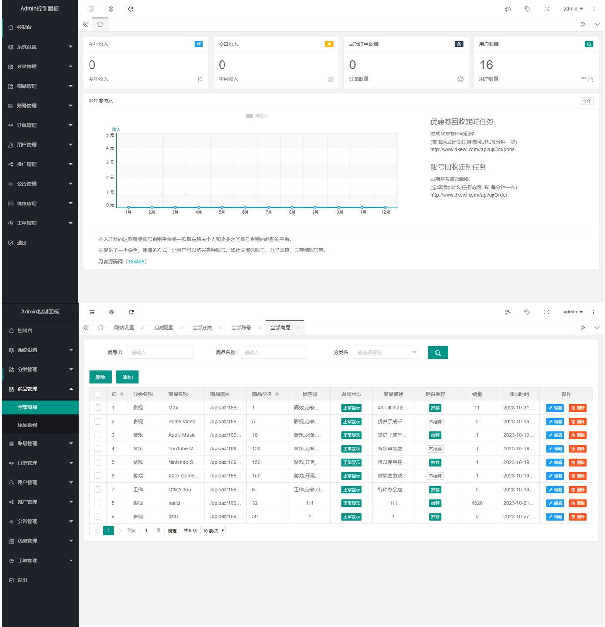 这款租号平台源码,是采用常见的租号模式,目前网络上较为少见。其主要功能包括:支持单独租用或合租模式,采用易支付通用接口进行支付,添加邀请返利功能以推广,提供用户提现功能,添加工单系统,前台UI适配移动端和PC端,支持邮箱登录(即注册模式),可添加不同类型的优惠卷,添加公告系统,管理员可在后台发布相关文章。