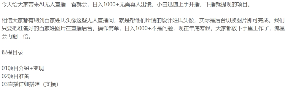 科技 抖音课程 数字化系列 新媒体运营 2024-01-29 无需真人出镜AI无人直播课程 AI无人直播一看就会,无需真人出镜,小白迅速上手开播... 生成海报 下载海报 相关资源抖音财神祝福贴壁纸号新玩法用AI工具视频重绘美女-普通人逆袭的不二之选只需一个软件就能在家轻松搞定录课直播(obs软件教学)46节课程软件一键生成原创美女视频全平台通用引爆流量热舞美女直播24小时矩阵全天挂机被动收入热门项目 下载 大礼包 文案大全 素材 致富技术 视频 讲座 课程 软件 运营 问题解答 本资源下载说明:本站也是始于兴趣,源于网络,仅用于学习及研究使用,切勿用于商业用途,如侵权联系删除! 其版权归该资源的合法拥有者所有。漫资源 » 无需真人出镜AI无人直播课程