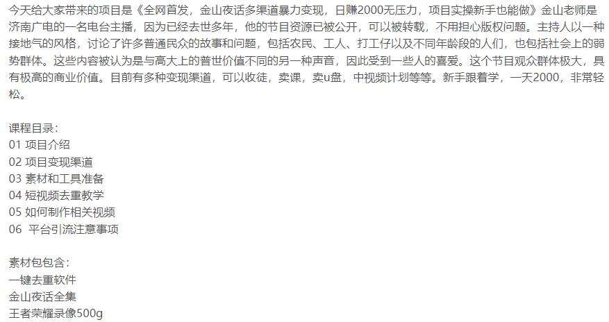 漫资源 数字化系列 新媒体运营 资源分享 2024-04-06 抖音快手“情感矛盾”赛道-金山夜话-附全集资料实操项目 全网首发,金山夜话多渠道,项目实操新手也能做... 生成海报 下载海报 相关资源玩赚数字人操作员直播搭建/多路开播/选品技巧/0-1开播流程抖音财神祝福贴壁纸号新玩法零成本玄学粗暴引流最新教程各类直播间搭建调试用AI工具视频重绘美女-普通人逆袭的不二之选 下载 大礼包 文案大全 素材 致富技术 视频 讲座 课程 软件 运营 问题解答 本资源下载说明:本站也是始于兴趣,源于网络,仅用于学习及研究使用,切勿用于商业用途,如侵权联系删除! 其版权归该资源的合法拥有者所有。漫资源 » 抖音快手“情感矛盾”赛道-金山夜话-附全集资料实操项目